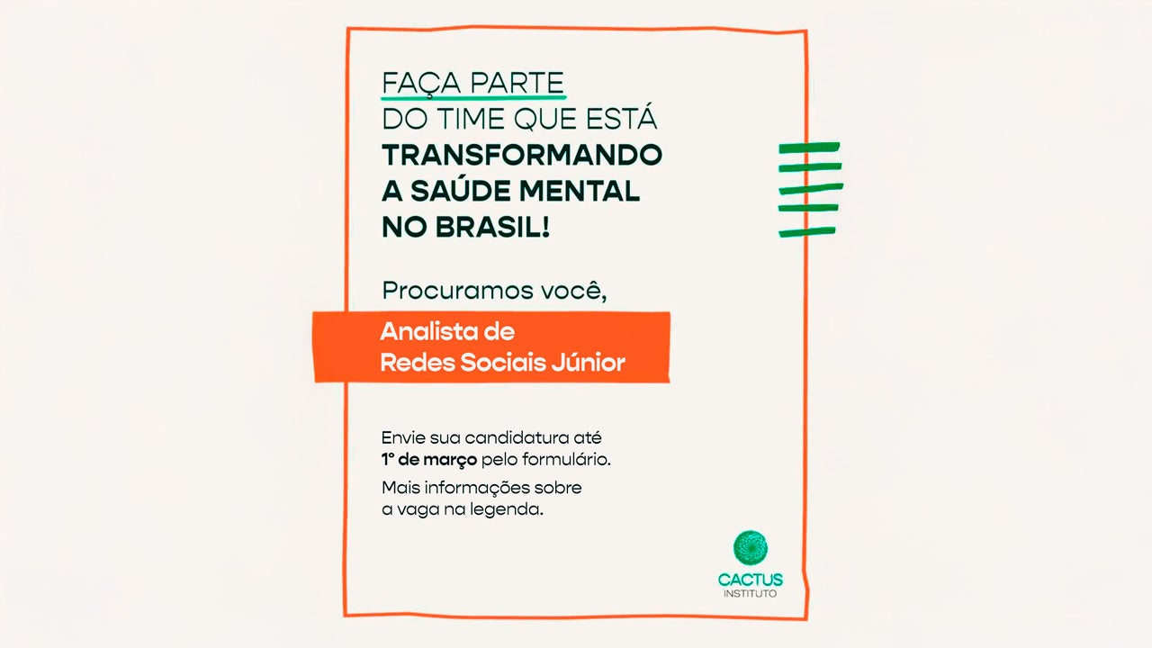 O Instituto Cactus está com inscrições abertas para a vaga de Analista Júnior de Redes Sociais. A oportunidade é voltada a profissionais interessados(as) em atuar na produção de conteúdo digital com foco em promoção e prevenção em saúde mental, especialmente para o público jovem.